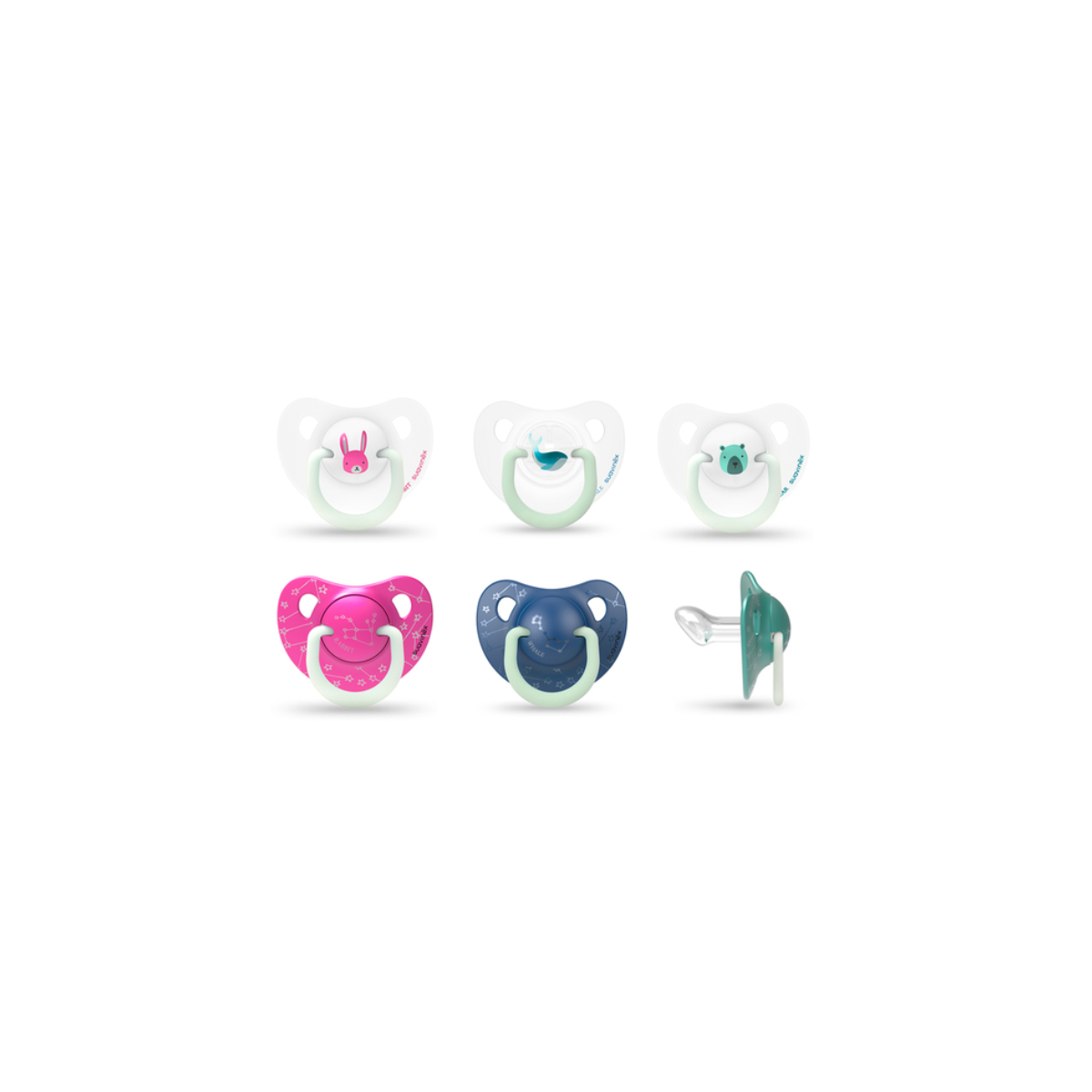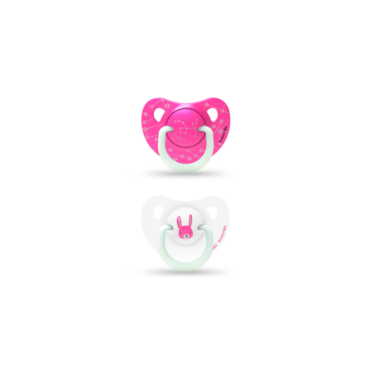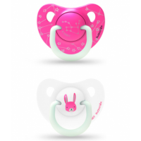 Se presentan en un pack de dos unidades, un chupete especial para el día y otro chupete para la noche. Ambos chupetes disponen de la anilla luminiscente que brilla en la oscuridad para encontrar el chupete fácilmente en la cuna del bebé si se le cae.