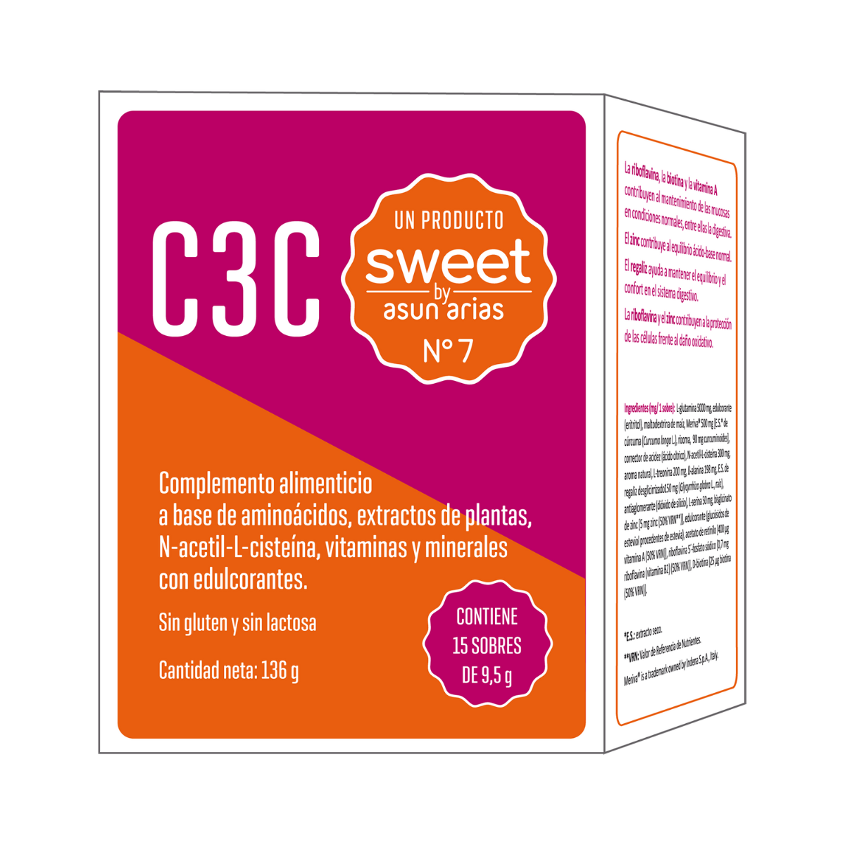 L-glutamina 5000mg, edulcorante (eritritol), maltodextrina de maíz, Meriva® 500mg [ES de cúrcuma (Curcuma longa L.), rizoma, 90mg curcuminoides], corrector de la acidez (ácido cítrico), N-acetil-L-cisteína 300mg, aroma natural, L-treonina 200mg, β-Alanina 198mg, E.S. de regaliz desglicirrizado 150mg (Glycyrrhiza glabra L., raiz), antiaglomerante (dióxido de silicio), L-serina 50mg, bisglicinato de zinc [5mg de zinc (50%VRN)], edulcorante (glucósido de esteviol procedente de estevia), acetato de retinilo [400mcg vitamina A (50%VRN)], riboflavina (vitamina B2) (50%VRN)], D-biotina [25mcg biotina (50%VRN)].