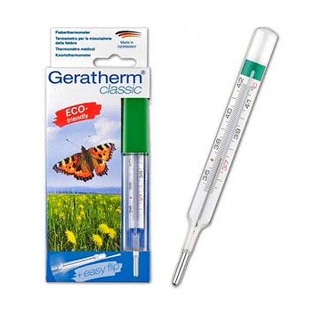 Fabricado en vidrio, resulta apto para alérgicos (sin níquel ni PVC) y permite una limpieza y desinfección que lo convierten en un termómetro 100% higiénico. No necesita pilas, por lo cual es más ecológico. Está patentado mundialmente por Geratherm.