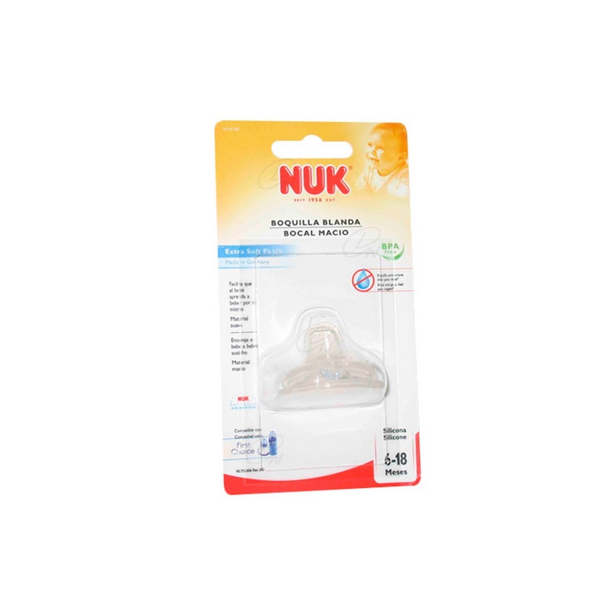 Boquilla es adaptable a cualquier biberón de Nuk First Choice. Con flujo normal pensado para la demanda del bebé a partir de los 6 meses de edad.