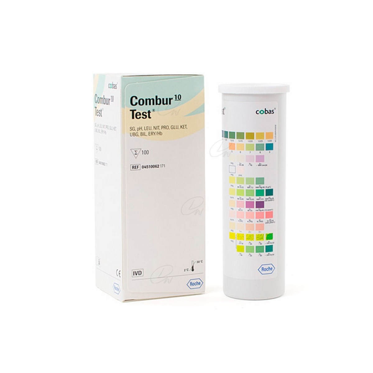 VALOR pH: Los valores pH más frecuentes en orina fresca de personas sanas se encuentran entre el 5 y 6. El test es específico para la detección de iones de hidronio, siendo el valor pH el logaritmo decimal negativo de la concentración de iones de hidronio. El papel reactivo contiene los indicadores rojo de metilo, fenolftaleína y azul de bromotimol.