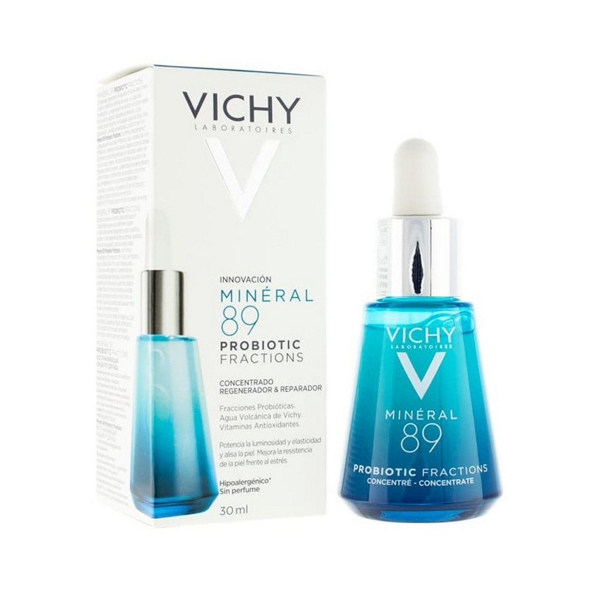 Minéral 89 Probiotic Fractions sérum regenerador y reparador, compuesto por fracciones probióticas cultivadas con Agua Volcánica de Vichy y potenciadas con vitaminas antioxidantes como la niacinamida, regenera los signos visibles de la salud de la piel (luminosidad, elasticidad, líneas de expresión).
